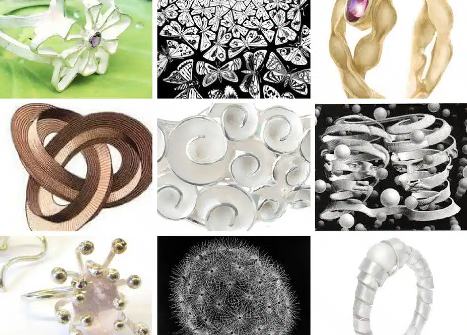 Escher gebruikte dezelfde thema`s als ik in mijn sieraden. Hij liet zich inspireren door ritmes in de natuur (dag en nacht, water en lucht, de seizoenen), oneindigheid en herhalingen. Dit zijn precies de thema`s waar ik mee werk en die ik je ook uitleg in deze video. Mijn ring “dubbele möbius” is ook geïnspireerd op een bezoekje aan het Escher museum, 8 jaar geleden. Ik werk veel met repeterende vormen. Ik onderzoek die vormen, door steeds van dezelfde basisvorm te vertrekken en daar andere inkepingen in te maken of anders te vouwen. Zo ontstaan steeds weer nieuwe vormen. Meestal met een symbolische betekenis. Deze vormen zie je terug in mijn verschillende collecties.
