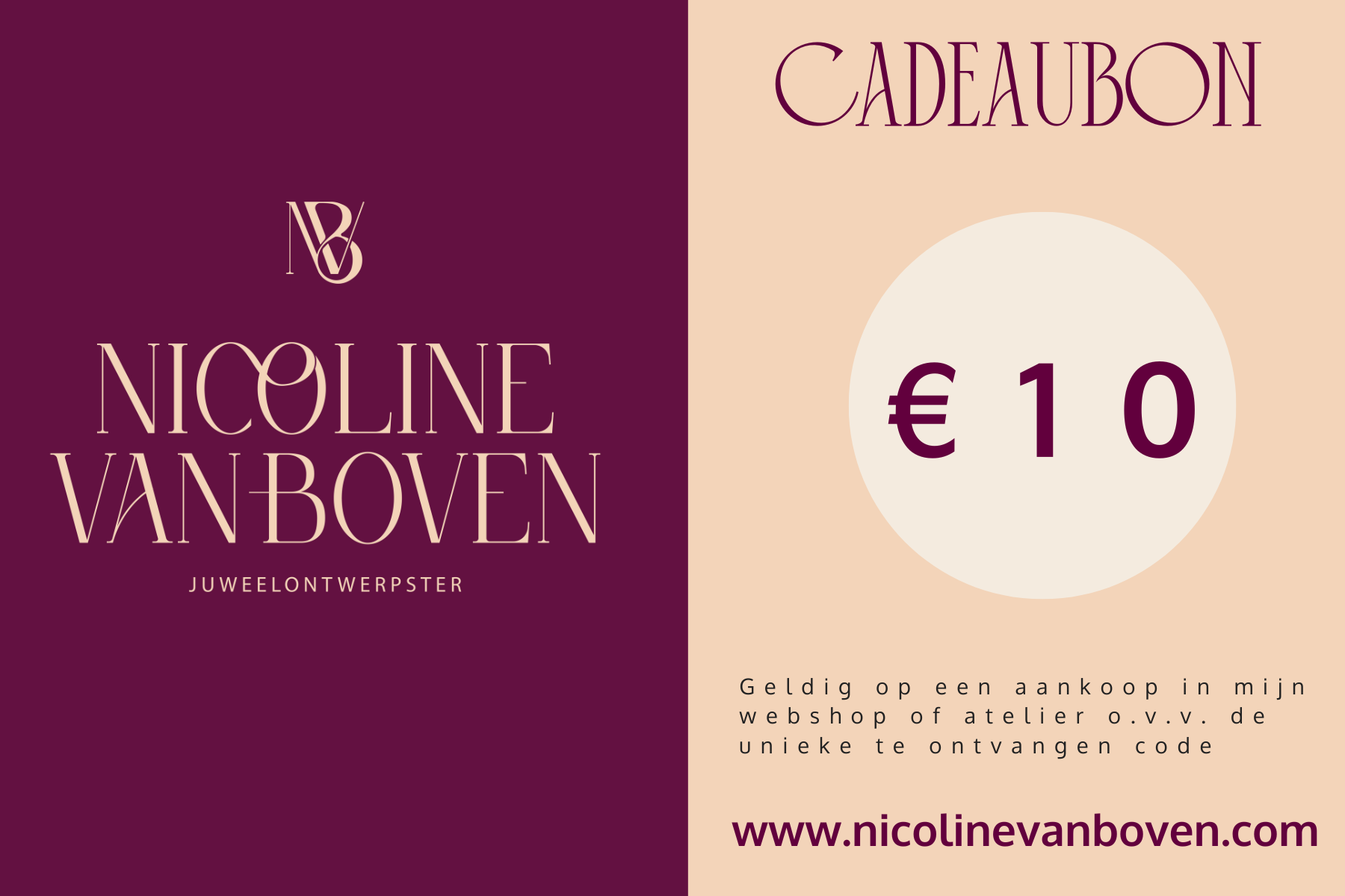Er zijn bonnen van €10, €25, €50, €75, €125, €150, €200 en €250. Wil je een bon van een afwijkend bedrag, stuur me dan een mailtje naar info@nicolinevanboven.com. Dan krijg je een factuur voor het gewenste bedrag en de bon met code toegestuurd.