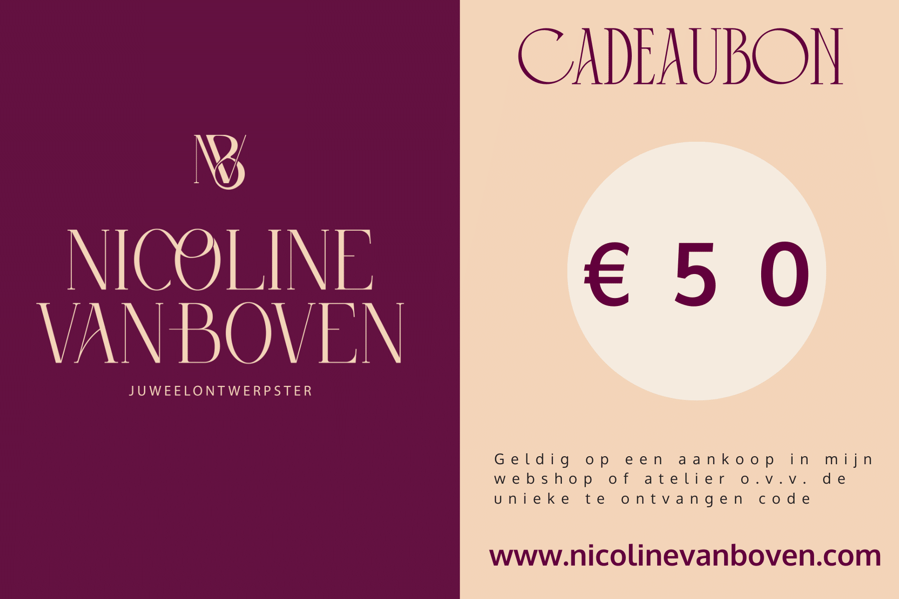 Een sieraad is enorm persoonlijk. Daarom kun je vanaf nu ook cadeaubonnen kopen in mijn webshop! Zo kun je zelf het te besteden bedrag bepalen en kan de ontvanger zelf een mooi sieraad uitzoeken. De bon is ook te gebruiken voor een sieraad naar eigen wensen.