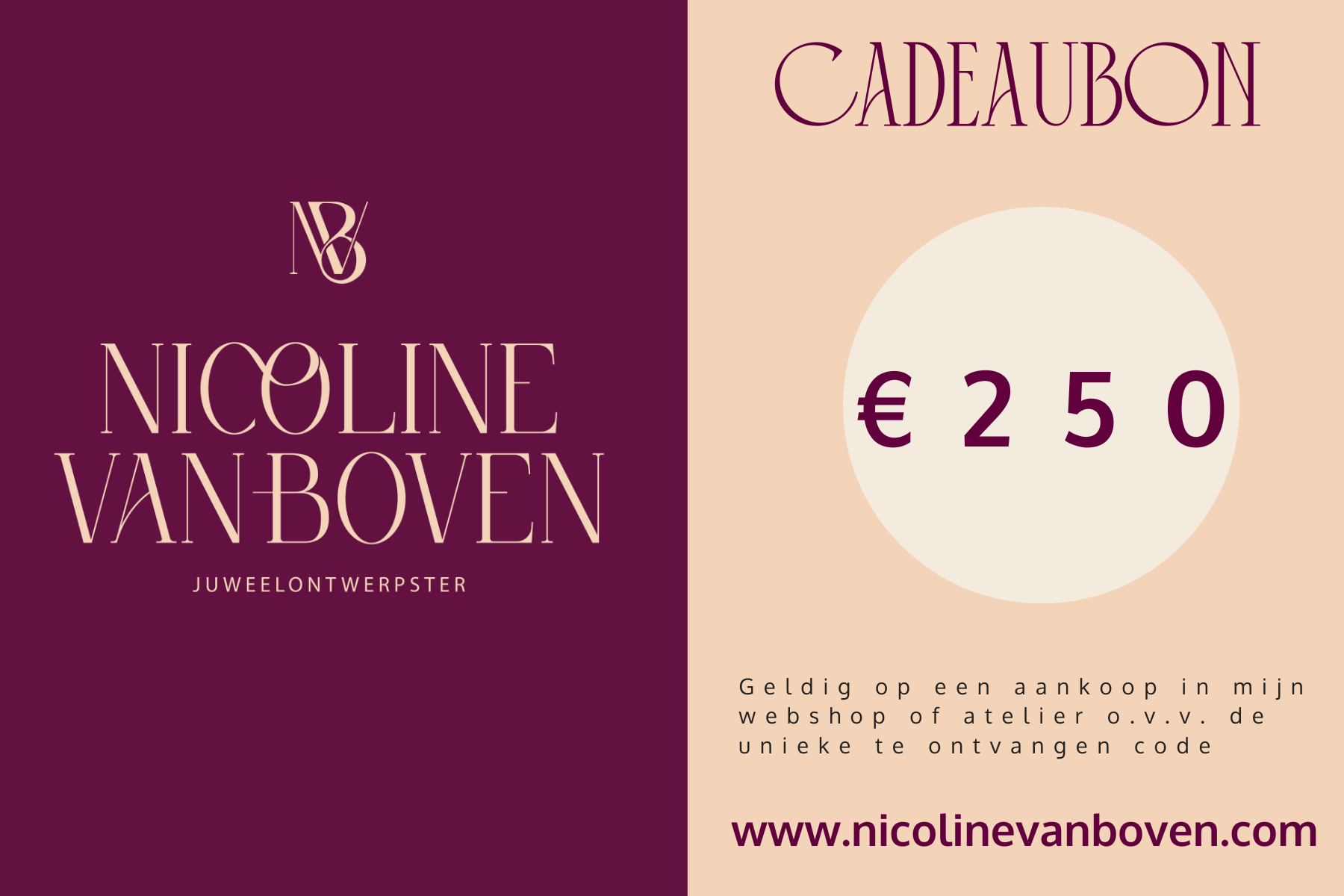 Een sieraad is enorm persoonlijk. Daarom kun je vanaf nu ook cadeaubonnen kopen in mijn webshop! Zo kun je zelf het te besteden bedrag bepalen en kan de ontvanger zelf een mooi sieraad uitzoeken. De bon is ook te gebruiken voor een sieraad naar eigen wensen.