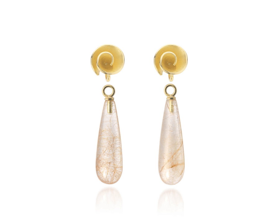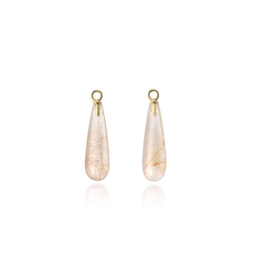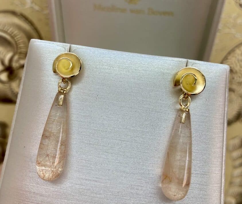 Deze roosjes stekers kun je zo dragen (zonder hangers) of samen met de afneembare hangers met rutielkwarts. De hangers zitten vast met een wisselsysteem. Zo kun je er steeds weer een andere combinatie van maken, passend bij je outfit! Er zijn meerdere losse hangers (en stekers) beschikbaar. De rutielkwartsen zijn heel neutraal van kleur, doorschijnend met subtiele goudkleurige rutielnaalden. Heel gemakkelijk overal bij te combineren. Of bestel een ander paar hangers naar wens in je favoriete kleur edelstenen of parels (prijs is dan op aanvraag, vraag naar de mogelijkheden).