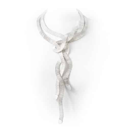 Daarbij is het een uniek statement stuk wat heel fijn draagbaar is, want ook dat vind ik belangrijk. De colliers uit deze collectie zijn namelijk flexibel door een zelfontwikkelde techniek (volledig met de hand gevouwen zilver) en draagt als een kledingstuk, zoal een sjaal die je omknoopt. Je kunt het met alles dragen: nonchalant en ook heel chique naar een feestje. Hij valt direct op en is ook meteen een goede “conversation piece”.