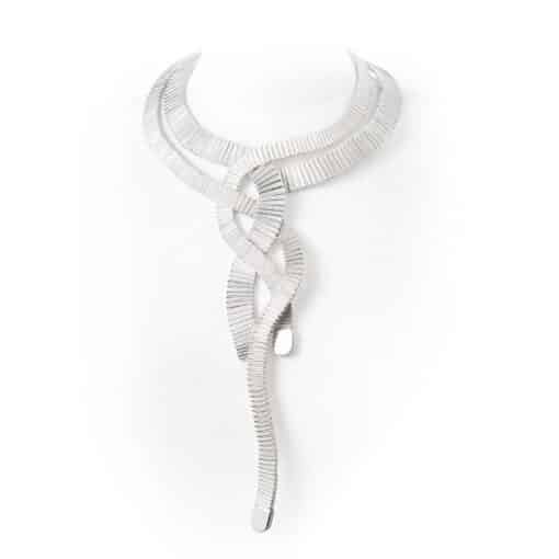 Daarbij is het een uniek statement stuk wat heel fijn draagbaar is, want ook dat vind ik belangrijk. De colliers uit deze collectie zijn namelijk flexibel door een zelfontwikkelde techniek en draagt als een kledingstuk, zoal een sjaal die je omknoopt. Je kunt het met alles dragen: nonchalant en ook heel chique naar een feestje. Hij valt direct op en is ook meteen een goede “conversation piece”.