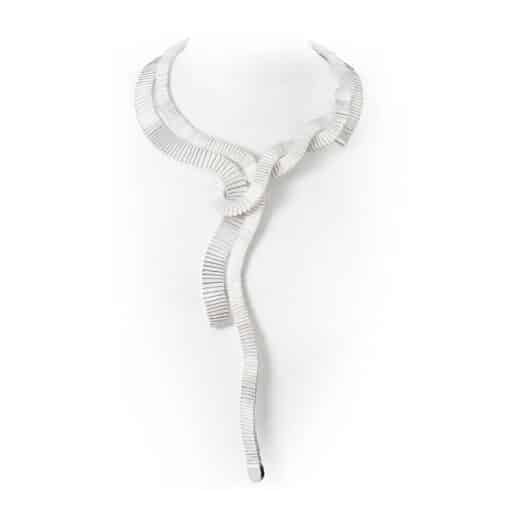 Daarbij is het een uniek statement stuk wat heel fijn draagbaar is, want ook dat vind ik belangrijk. De colliers uit deze collectie zijn namelijk flexibel door een zelfontwikkelde techniek en draagt als een kledingstuk, zoal een sjaal die je omknoopt. Je kunt het met alles dragen: nonchalant en ook heel chique naar een feestje. Hij valt direct op en is ook meteen een goede “conversation piece”.