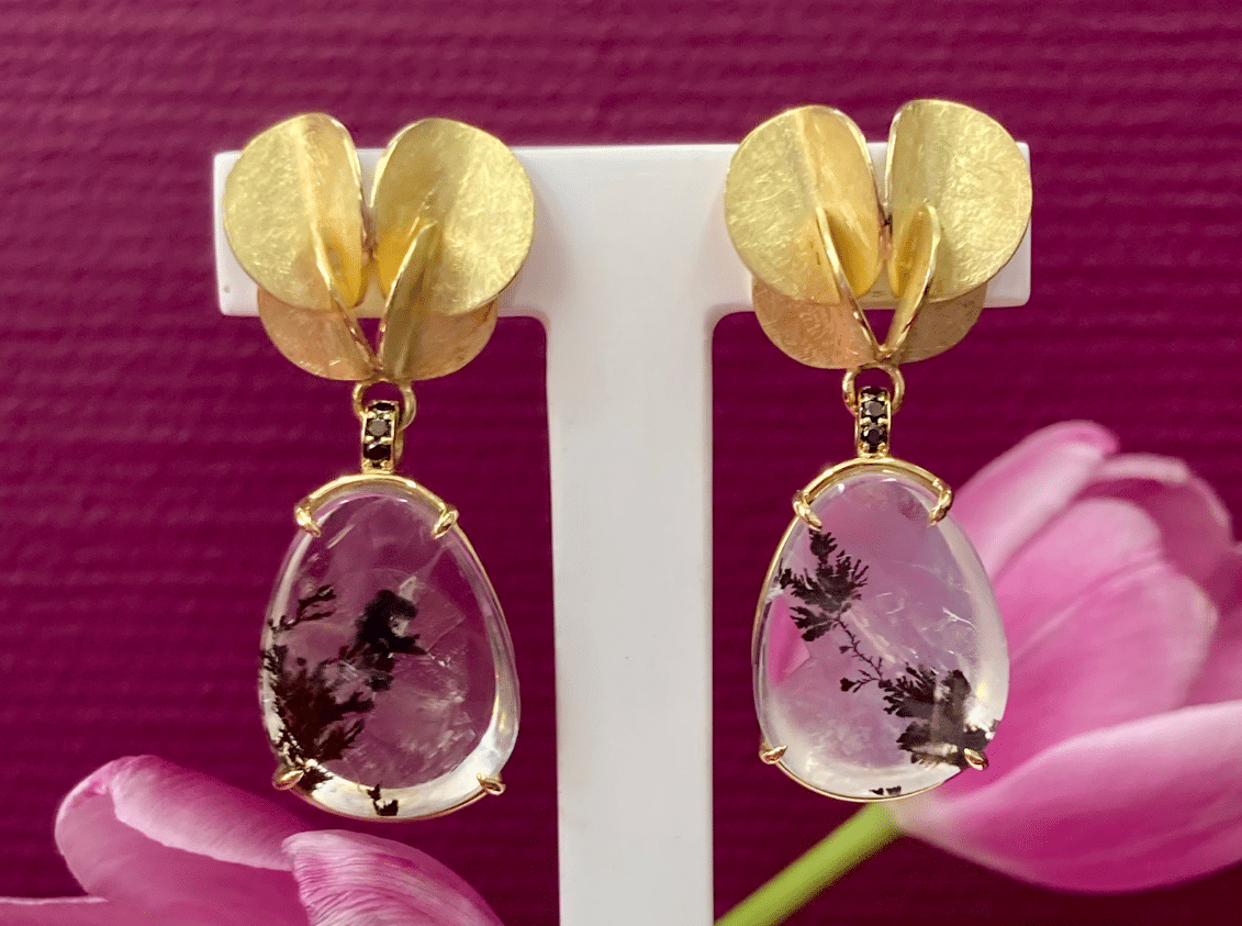 Handgemaakte 18 karaat gouden oorbellen met dendriet en zwarte diamanten