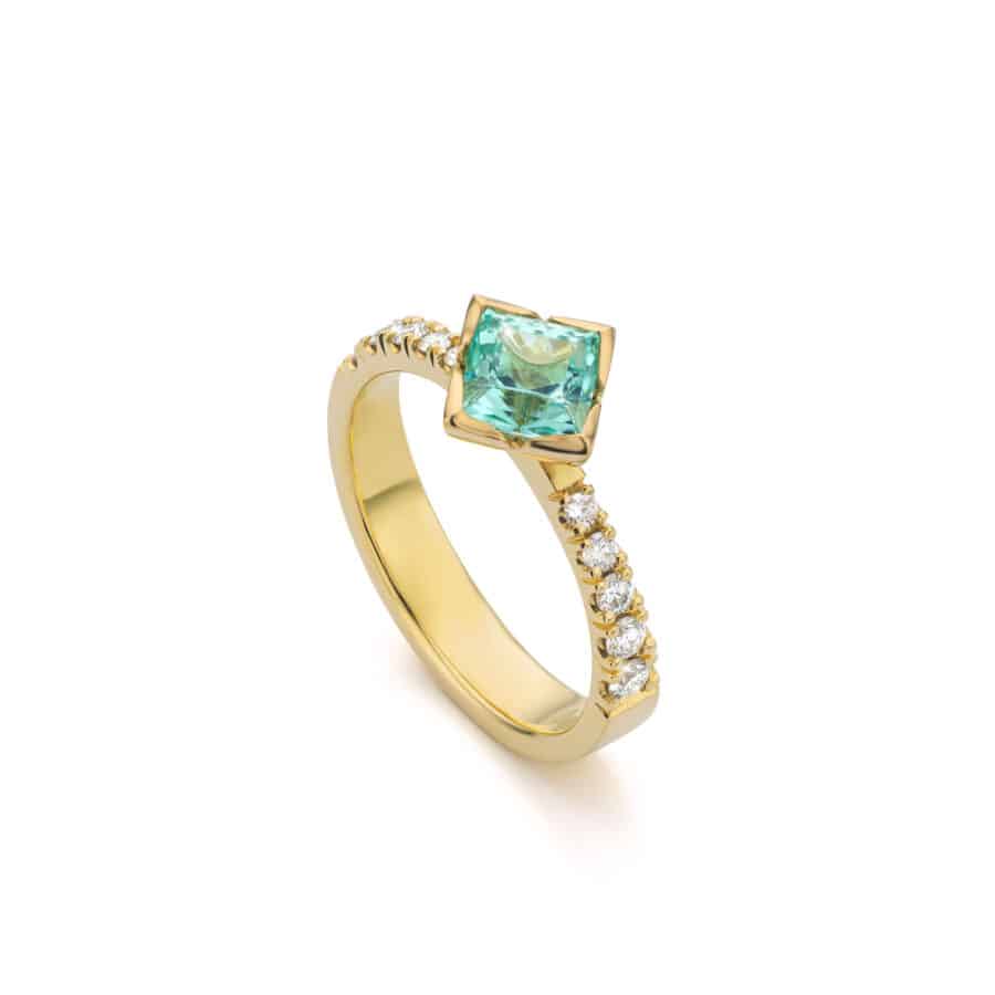 Midsummer Night’s Dream ring on Ibiza – exclusieve 18 karaat gouden ring met toermalijn in prachtige azuurblauwe kleur en diamant.