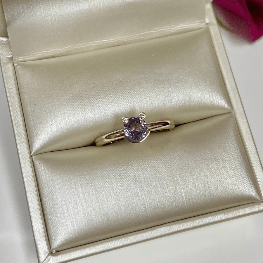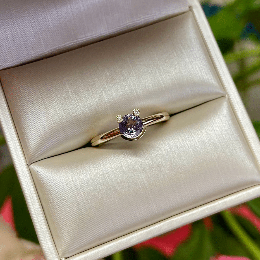 Gouden ring met paarse spinel en diamant in smiley zetting